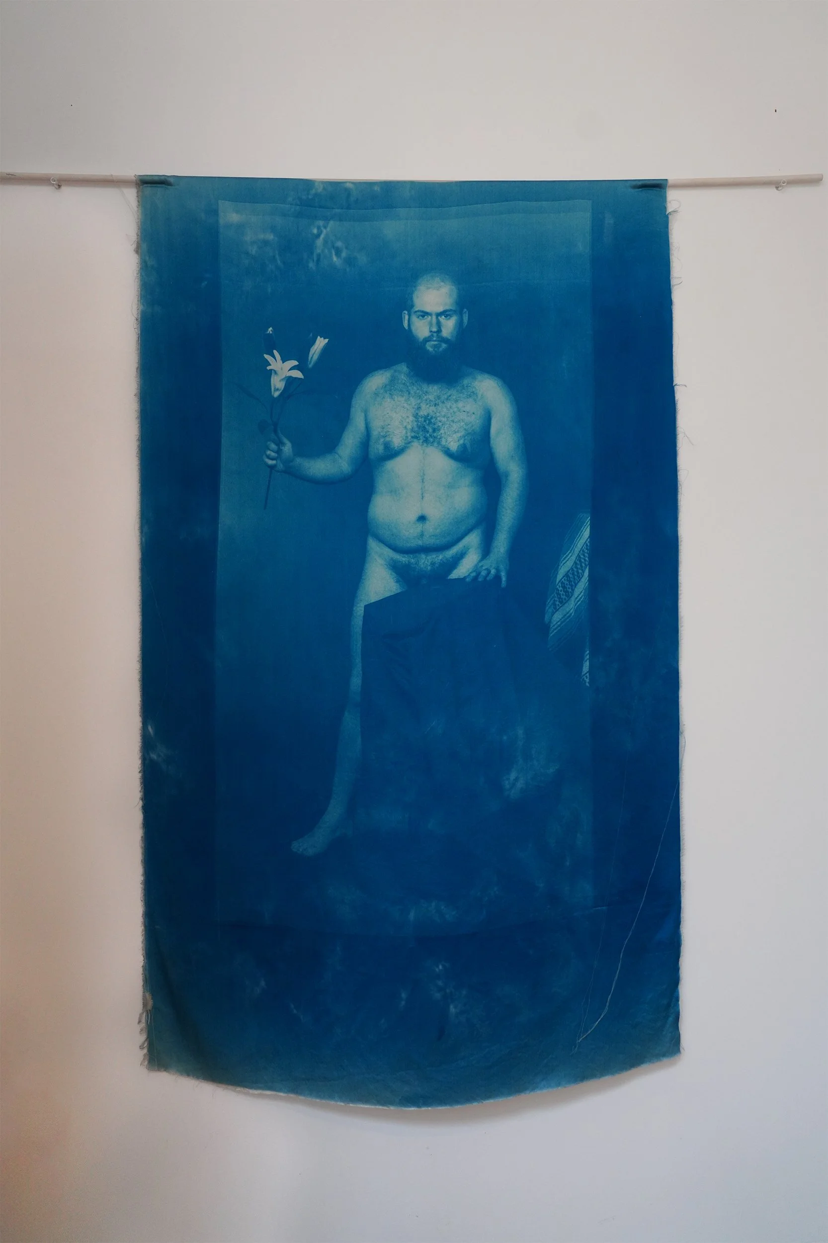 Although my physical form is masculine, my spiritual nature is more attributed to the feminine. Growing up, I could identify with my male peers, but I always felt a distinct emotional divergence; I identified more with my sister and female friends. Through this body of work, I am drawing you into the space in between—a dimension both known and unknown, as I navigate these uncertainness and experiences of myself. Through my photographic studies, John Dugdale and his book Life’s Evening Hour found their way into my awareness. I could see myself in him; it felt like I was looking into a mirror. Dugdale lost most of his vision through complications of HIV, but his ability to “see” did not affect his investigation of his unsighted self. He stated in an interview that his clarity of sight came so strongly from inside. His deep Prussian blue cyanotypes mesmerized me, eliciting a visceral response within. Channeling Dugdale’s vulnerability and honesty into my project, the outcome is the subsequent cyanotypes on silk.